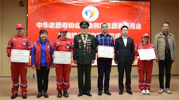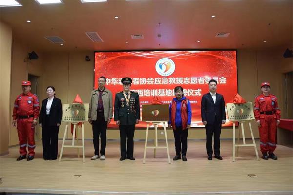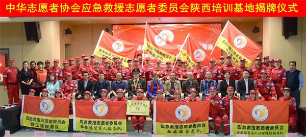 中志协应急委陕西省培训基地主任潘琳、副主任薛江宏、刘嘉欣和杨淑波、马升云、刘波、刘子平、王婉歌等共同为中华志愿者协会应急救援志愿者委员会陕西培训基地揭牌。