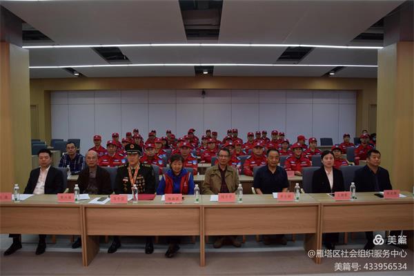 参加本次会议的领导和嘉宾有:西安慈善会副会长杨淑波、中国人民解放军原英雄四连连长、一级战斗英雄、中华志愿者协会应急救援志愿者委员会顾问马升云,原中央党校函授学院院长、西安市党校巡视员刘子平,陕西省安全厅原副厅长周兴福、陕西省高级人民法院原纪委书记齐士树,雁塔区社会组织孵化基地主任刘波,陕西君睿培训学校校长王婉歌,中华志愿者协会应急救援志愿者委员会陕西服务队队长潘琳,西安服务队队长薛江宏,咸阳服务队队长严自强,榆林服务队队长高忠利,铁工建服务队队长庞朝兵,西安退役军人服务队队长马丽,法律援助服务队队长王兴美,西安金色圆梦服务队队长袁萍,高陵服务队队长陈小宁,礼泉服务队队长陈海刚及志愿者、新闻媒体120多人出席揭牌仪式。