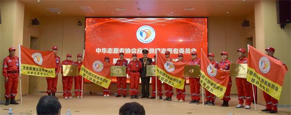 中志协应急委陕西省志愿者培训基地副主任薛江宏,宣读了关于成立服务队及任命书文件。潘琳、马升云为咸阳服务队、榆林服务队、铁工建服务队、高陵服务队、礼泉服务队各服务队授牌、授旗。各成立服务队集体宣读誓言。