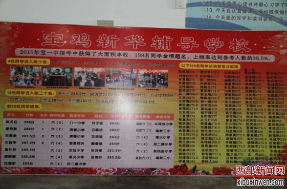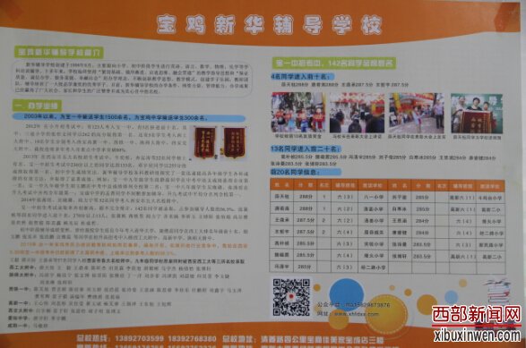 西部新闻网讯 新华辅导学校为1998年8月由宝鸡市教育局批准创建的专业从事中小学阶段文化课程课外辅导学校(办学许可证号:161030270000391)。十八年来,学校始终坚持“紧贴基础、循序渐进、启迪思维、融会贯通”的教学思想和“保证质量、诚信办学、良心育人、服务家庭、奉献社会”的办学理念,不断创新教学思想、教学模式,不断加大基础投入,改善办学条件,打造强有力的教师团队,扎实提高学校的管理水平和专业能力,促使教学质量不断提高,使学校年年迈新步,年年上台阶。在这几年激烈的行业竞争中,学校仍然在西安各大名校和宝一中小升初、初升高招考中获得大面积丰收,上线率连年固定在38%左右。