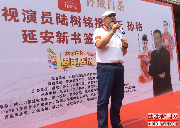 丹凤眼、卧蚕眉,高大威武、美髯飘洒的94版《三国演义》扮演者陆树铭,威风凛凛地站立在签售台的一侧,在广大读者的眼前,今年已过耳顺之年的陆树铭,千真万确就是当年“过五关、斩六将”的义帝关公。在签售会上,陆树铭还表示,来现场的延安市民们代表了热情好客的延安人,也代表着延安人民他的真诚的爱,非常感谢。在今年的5月25日将会在西安曲江华美达酒店举办新闻发布会,7月16日他会在要举办《一壶老酒孝道天下》演唱会,,欢迎延安的父老乡亲前来观看本次演唱会,他还现场演唱了《一壶老酒》,引发了现场市民的阵阵掌声和合唱。陆树铭说:“百善孝为先,我扮演关公就是传播关公一种精神,弘扬孝道文化。”关羽精神在任何时候都不会被淘汰,它所体现的仁、义、礼、智、信、孝等内容,不但与延安精神是相通的,更是与当前所提倡的现在社会的核心价值观相通的。“我会继续不遗余力地向全社会传播关羽精神,弘扬中华民族传统文化”,陆树铭说。