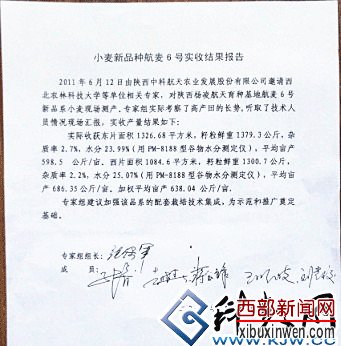 2011年6月12日由陕西中科航天农业发展股份有限公司邀请西北农林科技大学等单位相关专家鉴定:“航麦六号”具有高产、优质、抗病等特性,专家组曾对陕西杨凌航天育种基地航麦6号新品系小麦现场测定,专家组实地考察了高产田的长势,听取了技术人员的汇报,实收产量如图: