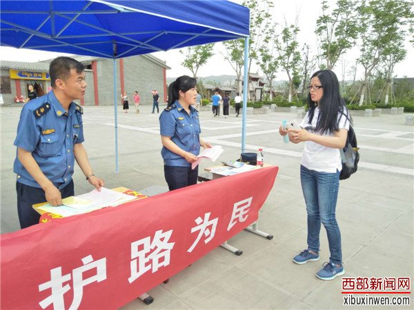 准备工作就绪,大家开始忙活起来,同志们为群众和游客讲解《公路安全保护条例》、公路与人们现代生活的关系、交通安全的重要性、爱路护路文明行为与城市文明的关系等等,有的讲解有的发宣传单,配合默契,愉快合作,很多游客被深深吸引驻足停留。
