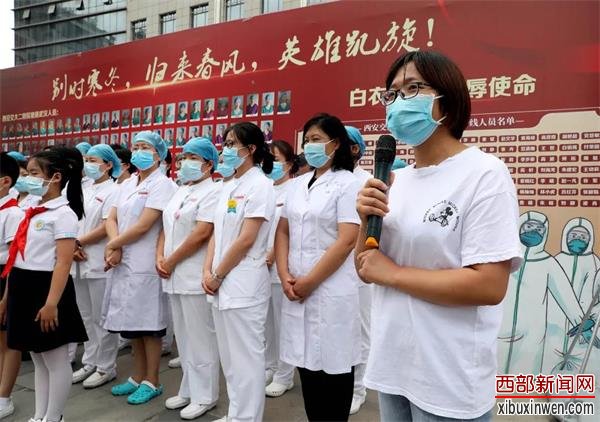 来自西安市浐灞第十七小学(原夏家堡小学)的学生代表袁晨瑶发言说:“2020年的春天,有这样一群人,他们无暇去感受春日的暖阳,无暇去绿色的田野上游览,无暇静静等待花朵的绽开。是他们,逆行而上,为我们筑起了抗击疫情的钢铁长城。在阳光报的引领下,我有了这样的一个宝贵机会,感到万分荣幸,我用照片的形式把最美的春天送给我们的抗疫天使,一张张照片,一丝丝关切,心连心的力量,将春日胜景重现在您的眼前,我高兴,我将错过的美景变成饱含爱意的纪念送给了您。”