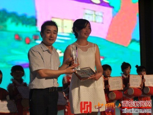 卞正华先生为在2013“童星耀三秦”新春晚会中荣获优秀组织奖的郑婕园长颁发奖杯