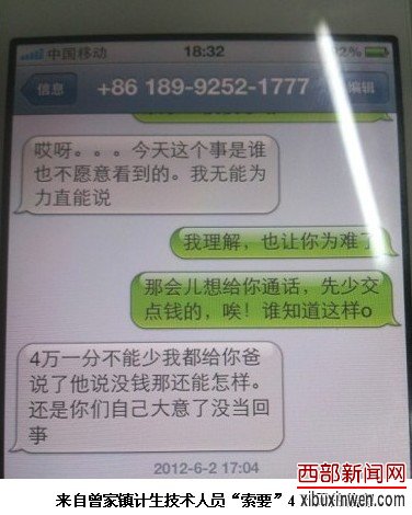 “其实,说白了镇政府的人就是因为我们没有按照他们开出的条件执行,只要交够4万元就让我嫂子生这个小孩,”妹妹邓吉彩说,“计生局在网上回复说是3月20日在“三查”工作中发现我嫂子怀孕的,可是我一直在家陪着我嫂子,从来没有见他们来我们村三查,也没有见他们给我嫂子下发任何不能怀孕的通知”。一条来自镇政府计生办工作人员的短信“4万一分不能少,我都给你爸说了他说没钱那还能怎样。还是你们自己大意了没当回事。”证实了邓吉彩所说的话。在曾家镇政府,通过陈副镇长提供的手机号码,证实短信内容出自该镇政府计生技术员袁芳的手机。然而,当记者电话与袁芳取得联系证实这件事时,袁芳否认编发该信息,并称该手机号是自己前两天才办理的,且推辞说:“冯建梅家的事,我根本不知道,你们别问我”随即挂断了电话。