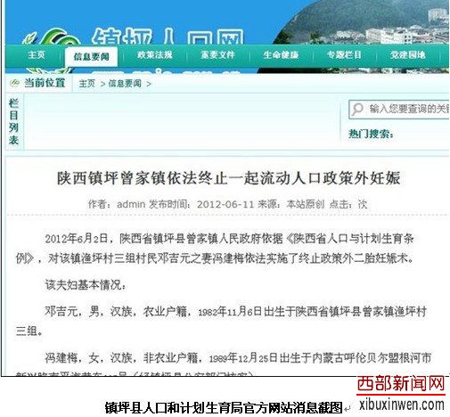 2012年6月12日,就在记者调查走访之前,在官网上看到了镇坪县人口和计划生育局(以下简称县计生局)题为“镇坪曾家镇依法终止一起流动人口政策外妊娠”的公告。