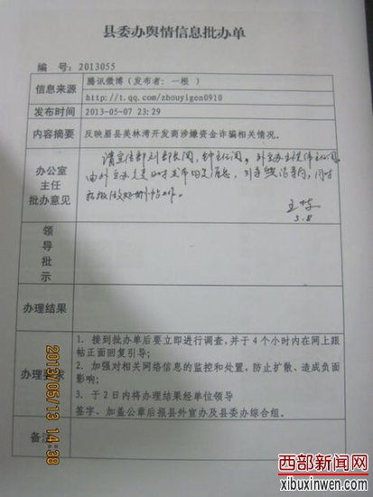 6月24日,腾讯微博网友@刘虎发了一条微博:“‘领导,腾讯微博上有舆情,咋办?’‘赶紧想办法删掉’。”该条微博的图片是一张眉县《县委办舆情信息批办单》,图片显示,该批办单编号为2013055,详细注明了信息来源、发布时间、内容摘要等内容。内容摘要为:反映眉县美林湾开发商涉嫌资金诈骗相关情况。在“办公室主任批办意见”一栏,有相关负责人的手写批办意见:由外宣办负责及时发布回复消息,引导舆论导向,同时积极做好删帖工作。批办人签字为王栋,时间为5月8日。“领导批示”、“办理结果”、“备注”三处空白。“办理要求”一栏注明3项具体要求:1.接到批办单后要立即进行调查,并于4小时内在网上跟帖正面回复引导;2.加强对相关网络信息的监控和处置,防止扩散、造成负面影响;3.于2日内将办理结果经单位领导签字、加盖公章后报县外宣办及县委办综合组。