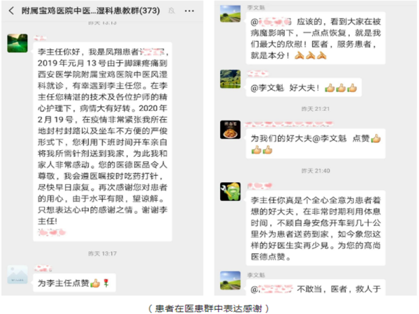 “放心,我给您上门送药!”疫情防控期间,家住凤翔区的许师傅因脚踝疼痛在当地医院多次治疗效果不佳,慕名来到西安医学院附属宝鸡医院中医科风湿免疫科就诊,入院诊断为强直性脊柱炎,经完善系统的住院治疗和护理,半个月后许师傅症状明显缓解,出院回家需继续抗炎、免疫抑制治疗,只需定期前往医院复查并取回药物继续服用便可。但受疫情影响,家中的药物出现断档,得知情况的李文魁主任马上联系到许师傅,毫不犹豫地说:“药一定要坚持继续服用才能尽早康复,别急,您把地址告诉我,今晚下班后我把药给您送家里去。”当晚,李主任按照许师傅提供的住址,亲自开车2小时将药品送到了他的家中,并为许师傅进行了复查,叮嘱他按时服药,坚持治疗,早日康复。这是一个平凡又不平凡的“逆行者”,这是一份疫情隔不断的医患情。