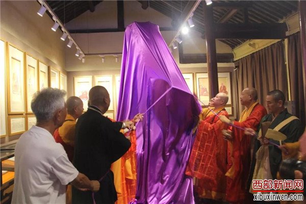 捐赠仪式结束后,宽旭和尚陪同增勤和尚及诸位诸山长老移驾展室内为宝幢揭幕并参观。