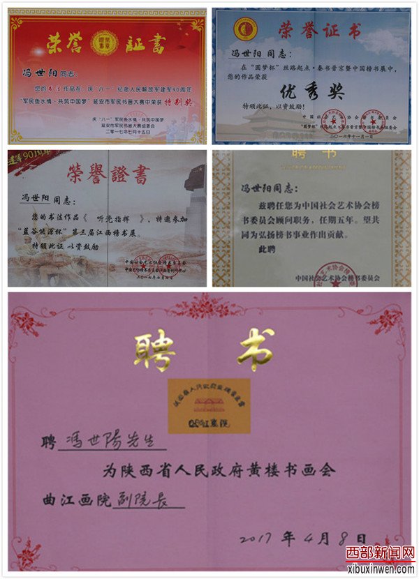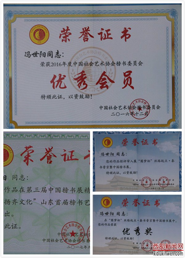2010年他担任陕西省秦风书画协会副主席。2012年以来先后四次在北京参加著名书法家张继、高炳山老师的研修班、国家开放大学书苑点睛研修班、中国榜书高研班。 2017年被聘为中国社会艺术榜书委员会顾问、陕西省人民政府黄楼书画会曲江书画院副院长。2018年被聘为西部新闻文化艺术研究院顾问。他的作品先后获得众多殊荣,但是他并没有骄傲,也没有停止对书法的创作;他依然坚持做着书法服务于大众的事情。冯世阳不忘初心砥砺前行 ,他体会到书法不仅仅是个人的情趣流露和意向表达,而且能充实生活,陶冶情操、强身健体;更能贴近民众,为人民服务,为社会服务。