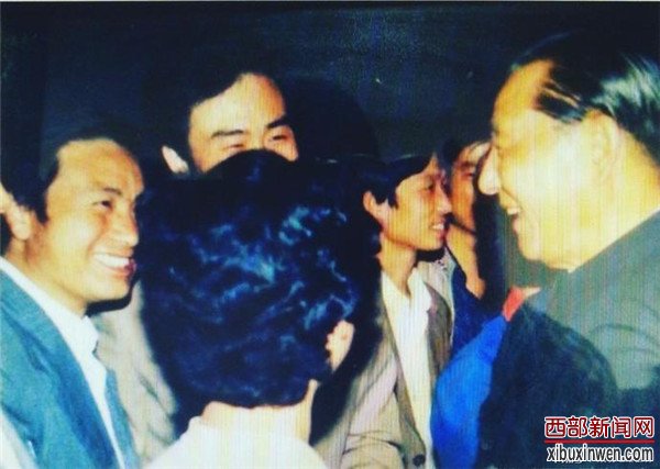 这是1982年,冀福记任商洛剧团团长期间,策划創演花鼓现代剧《六斤县长》,時任国务院副总理习仲勋老人家亲自调京,在怀仁堂为中央领导同志献演。此照是习老接见演员,冀福记演贫困老人,他亲切地握着冀福记的手说:"在扶贫的问题上,你们艺术家作了政治家的事。我安排把这个戏从天津上海南京武汉演它一阵子,让我们的干部看看,在致富的路上千万不能忘了穷人呀"。