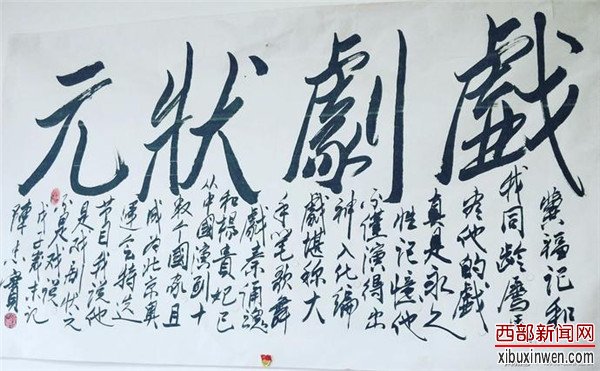 聊着聊着,不知不觉四个多小时就过去了,古城西安在夜色中绽放出华丽的色彩,一轮又一轮现代水墨画夹杂着时尚的旋律飘荡在大街小巷,冀福记在桌子上一笔一划为我们北京来的两个老乡写了四幅“福”字。望着他稍微弯曲的后背,隆起的前胸,开心的微笑,花白的头发,我突然想起“老骥伏枥,志在千里”。无疑,在连绵千里的秦岭脚下,作为陕西戏剧界的一代大师,冀福记这个名字将是一座时代的丰碑,历史不会忘记。(作者:李长征,中央电视台《成功之路》栏目制片人,资深媒体记者。)