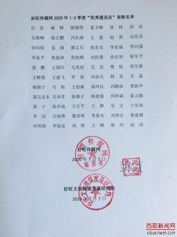 好旺传媒网坚持以图强兴旺宣传事业、唱好主旋律、奏响网媒时代“追梦好旺”最强音为己任,致力用新思想凝聚正能量,聚力发挥思想旗舰作用,全力打造传播力引导力影响力一流的新时代传媒思想矩阵。当前,决胜脱贫、决胜小康和大力推进乡村振兴战略已到了关键时期,为表彰先进、激昂士气,激励广大通讯员继续勤奋工作、勇于创作更多宣传思想精品,经好旺传媒网编委会研究决定、好旺文化传媒发展研究院评估并备案,同时根据投稿数量及质量,现对以下66位“优秀通讯员”进行表彰。(执笔/全媒体主编 梁纪委)
