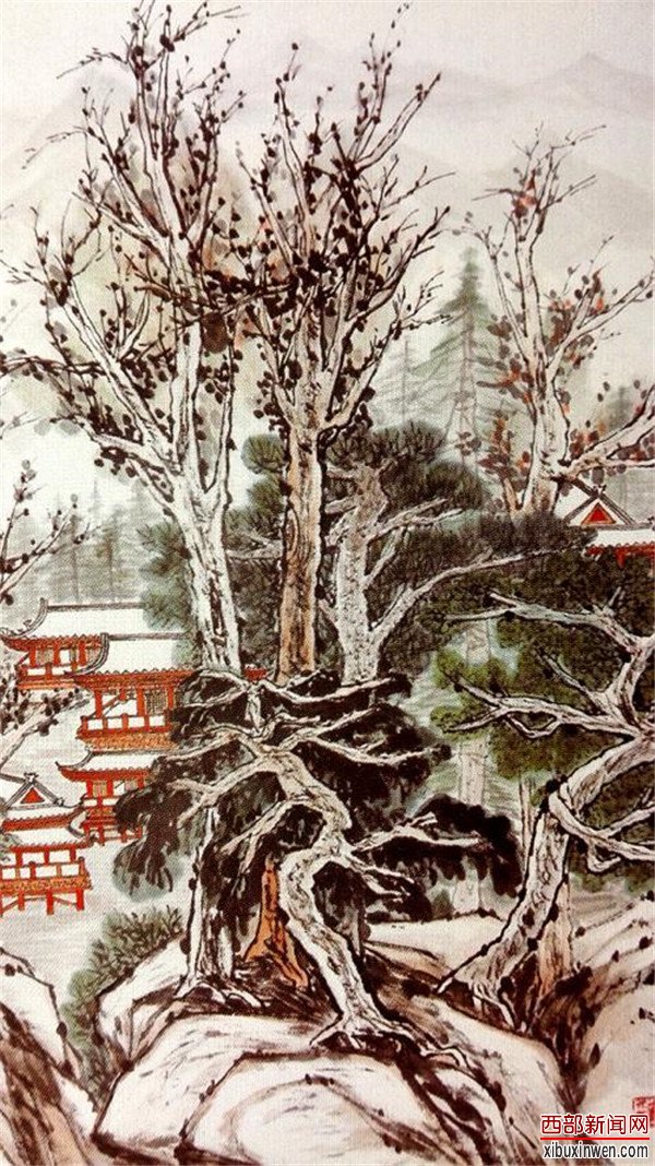 何老曾经专门告诫于振莲女士,要画好山水,要先学会画花草、树木、人物、房屋、山的走向、水的流向等,然后要学会布局和构图等。何老说:“画花犹如美女娇,画松犹如古人舞……画什么都要观其风貌,悟其神韵,解其寓意,深得其精髓。”业内人士皆知“画树难画根”,为了让于振莲女士学会画树根,何老专门带着她来到楼观台的一处景观,让她现场临习树根的各种画法。其后,于振莲女士多次去楼观台采风临习,渐渐悟出真谛,创作出《终南秋色》,且在该作中,把何老当年带着自己去楼观台的情景永远定格画中,作为永久的纪念。