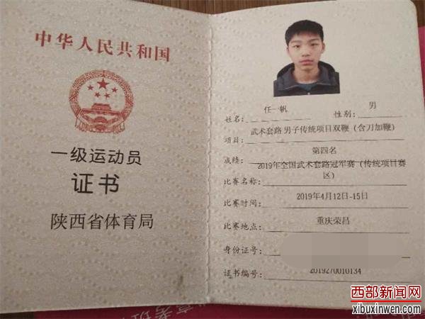 冬练三九、夏练三伏。任一帆经过三年多的磨炼,2012年9月被选入陕西省武术运动管理中心深造。老师觉得他确实是块练武的奇才,在他身上也注入更多的关怀和心血。长期的锻炼与磨炼,铸就了一帆坚定不移的意志和一身好武艺,得到学校老师、同学的一致认可。无论是学校还是全国各地比赛时,一帆都不负众望拿到各种荣誉和奖项。尤其是男子传统项目双鞭(含刀加鞭)尤为突出,2019年4月在全国武术套路冠军赛中获得全国第四名的优异成绩,由国家体育总局武术运动管理中心为他颁发获奖证书。他不仅为同学们树立了榜样,还为西北武术学院添光加彩。