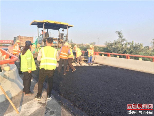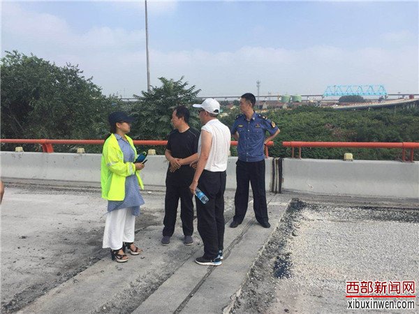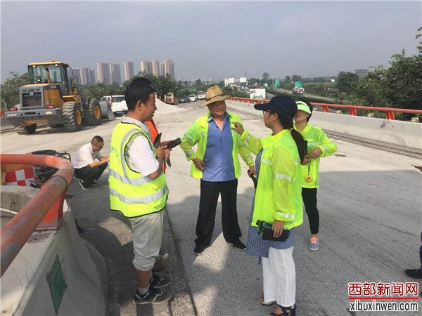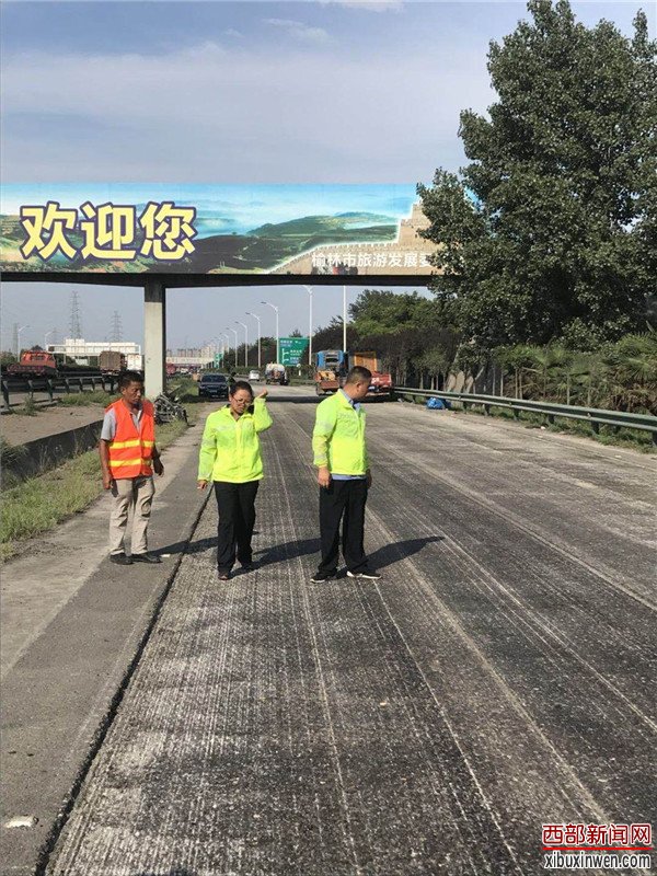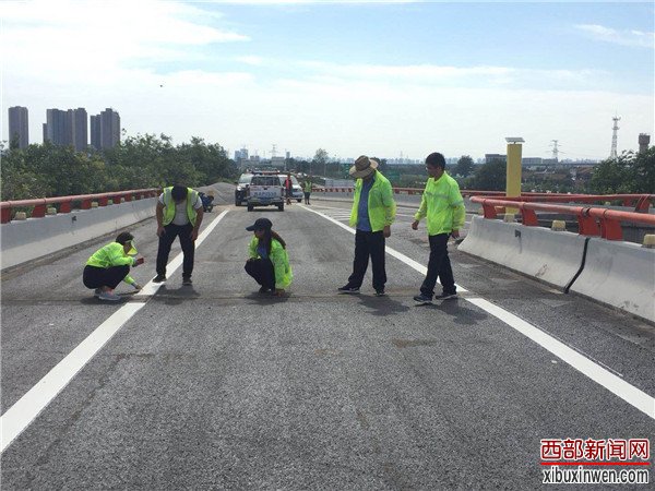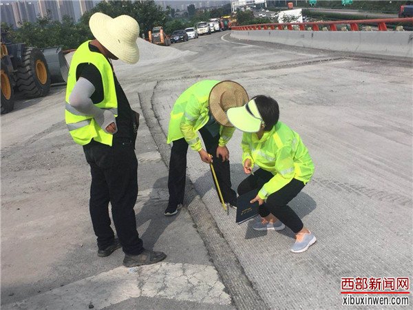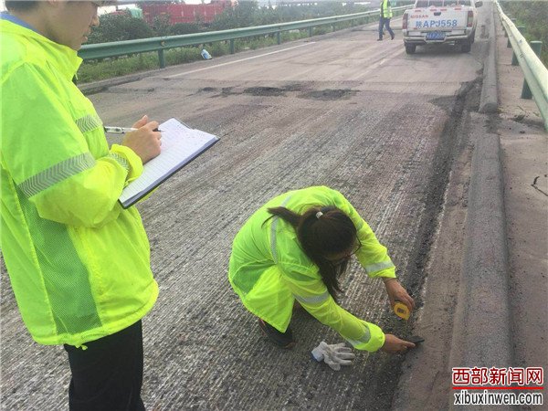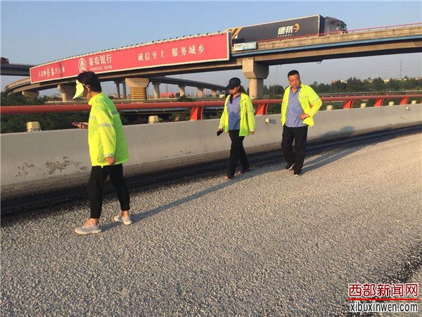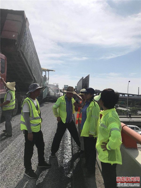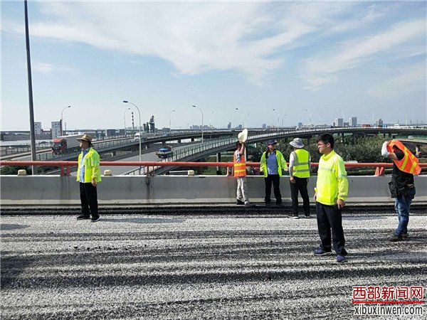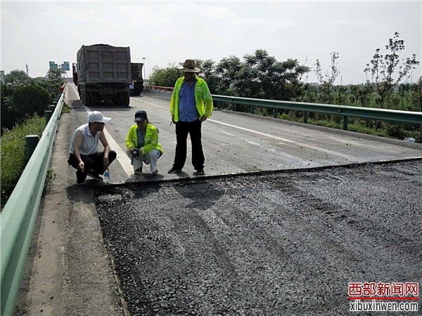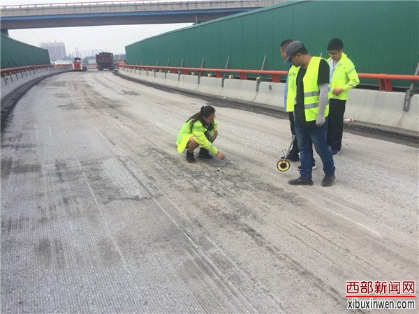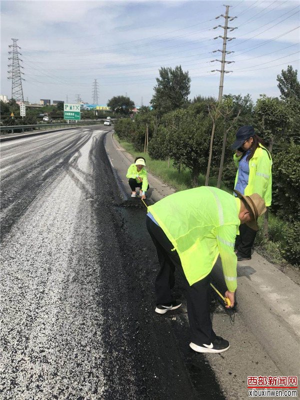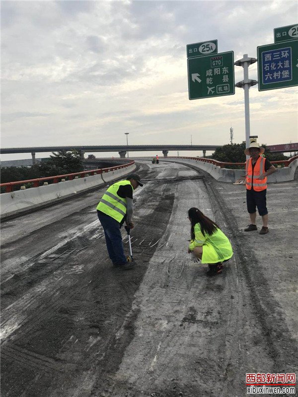 烈日当头,闷热无风。在西长高速机场段六村堡互通立交D、H、G匝道上,路面铣刨工程正在热火朝天的紧张施工。顶着烈日在高温的路面上,养护人员正在对铣刨后的路面进行数据测量,严把质量关,确保关键工序、关键部位进行实时同步监测。