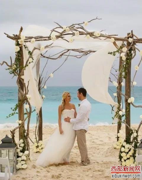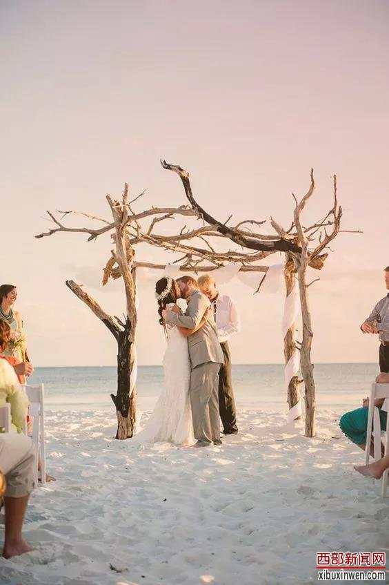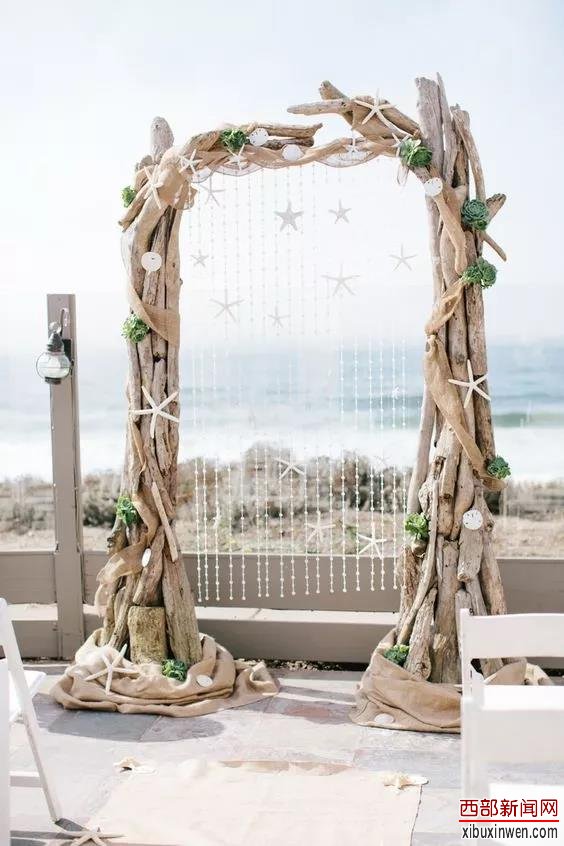 浮木对于任何海边、沙滩婚礼来说都是比较常见的。这样的拱门本身就很有质感,无需过多装饰,就与海滩婚礼融合在一起。