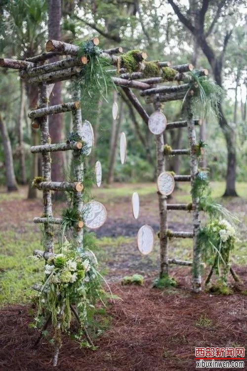 枯木枝带着自然的沧桑与纹理,用来搭建婚礼拱门,很有味道。