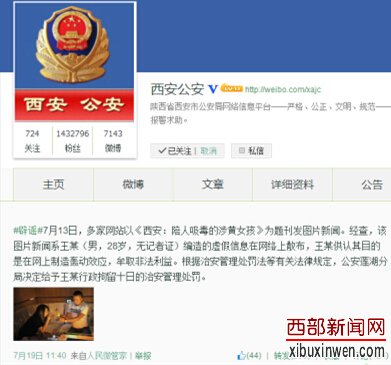 西部新闻网讯 日前,网上流传题为《西安:陪人吸毒的涉黄女孩》的图片报道,引起人们关注。对此,西安市公安局官方微博进行辟谣称,该图片系假记者编造的虚假信息。