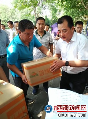张亚军(右)等领导发放慰问品记者在活动现场看到,该区总工会主席张亚军、副主席尹锋杰、纪检组长李瑛、各街道工会联合会工会主席、工会干事及辖区一线基层工会职工等100余人参加,工作人员将白糖、绿豆和酸梅粉等降温防暑物品发放到职工手中,感谢他们在高温下依然坚守在生产一线,用辛勤的劳动为全区卫生环境、道路交通及文明城市创建作出的贡献。