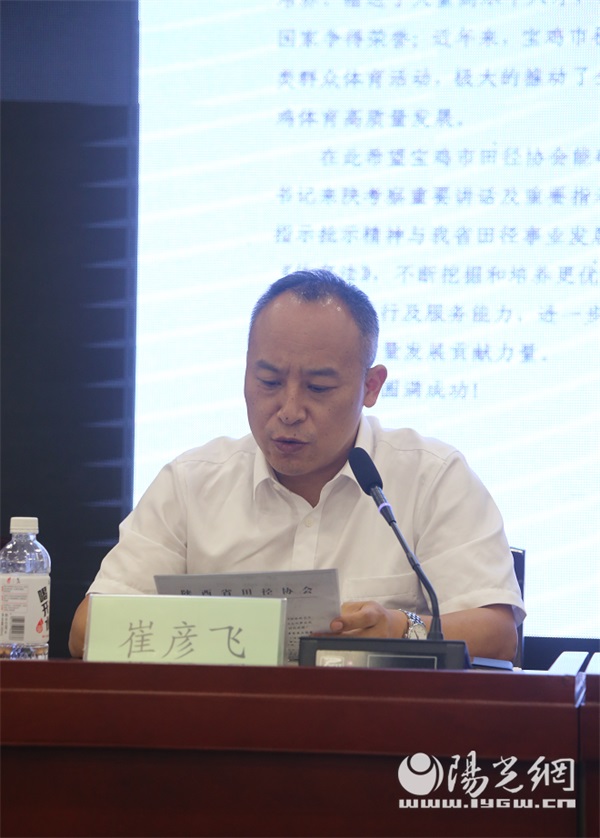 陕西省田径运动管理中心副主任,陕西省田径协会秘书长崔彦飞发表贺信,希望宝鸡市田径协会能够砥砺前行,不断提升协会管理、运行及服务能力,为推动陕西体育高质量发展贡献力量,发挥纽带作用,办老百姓满意的赛事和活动的同时,积极做好反馈,成为田径后备人才摇篮的基地。
