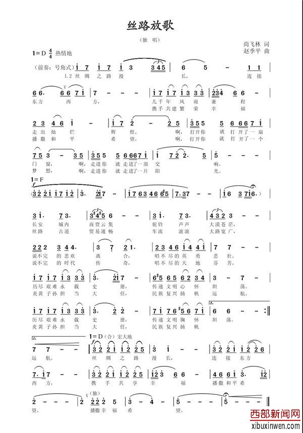 对新时代而言,丝路放歌以音符传情,用字词抒志,不仅仅在于忆过往,更是在唱开放。说不完中华民族历尽艰险,唱不尽华夏之路宽阔光明,整首歌以极高的标准达到了叙事和抒情的高度统一,不论是古长安的繁荣还是中华崛起的大气磅礴,都如画卷一般,随着音符徐徐展现。结尾“携手共享幸福,播撒和平希望”升华主题,写出新时代下的共同愿景。