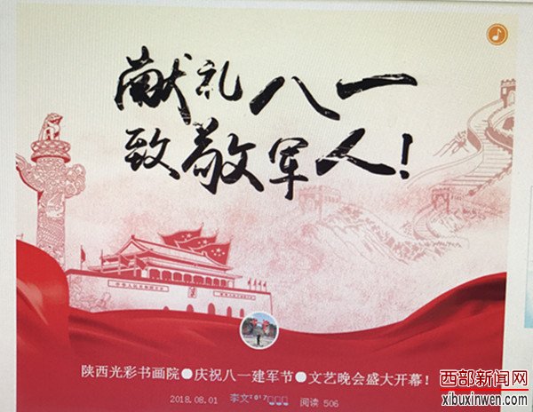 西部新闻网讯 (记者 张栢溪)走进新时代、共赴新征程、肩负新使命、展现新作为,坚持弘扬中华优秀传统文化,弘扬中华传统美德,弘扬时代新风,振奋中华民族精神!听党话跟党走,牢记使命、不忘初心,陕西光彩书画院为了庆祝八一建军节91周年纪念日,举办翰墨长安书画名家展,旨在通过文化建设,文化引领,弘扬好祖国传统文化,传播正能量,倾力提升全民文化文艺之热情。本次活动由著名主持人温馨主持,西部新闻网全程聚焦本次盛况!