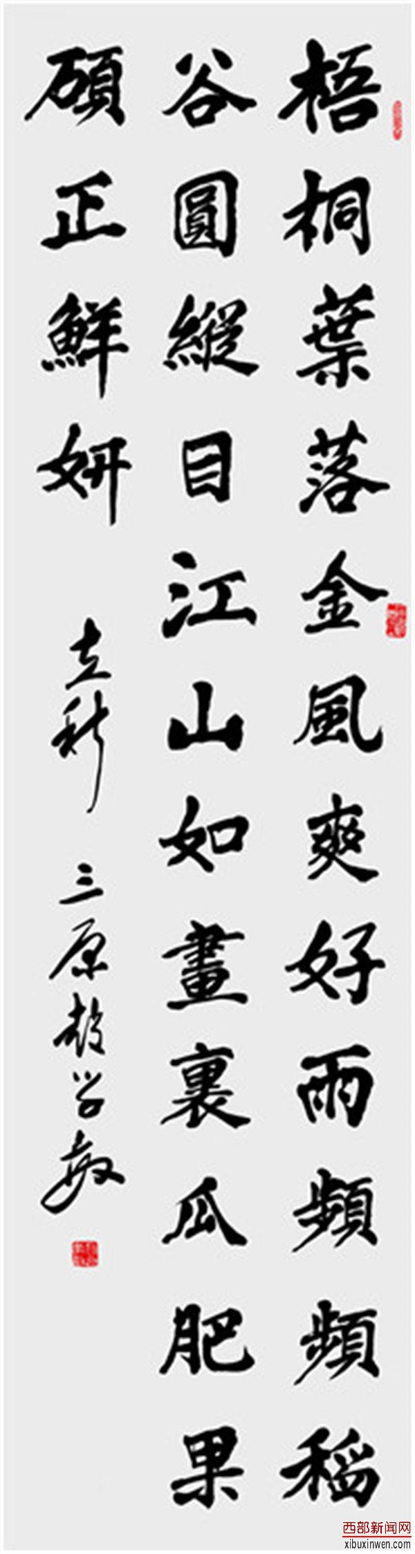 中国书协学术委员会委员、著名书法评论家胡传海评价:从学敏先生这幅《立秋》书法作品看出他的诗是围绕生活来展开的,内容很鲜活,看了以后觉得和我们的生活很贴近。而且书法有夯实的基础,写的气势磅礴,遒劲有力,非常大气,对我们专业书法者来说有很多学习的地方。