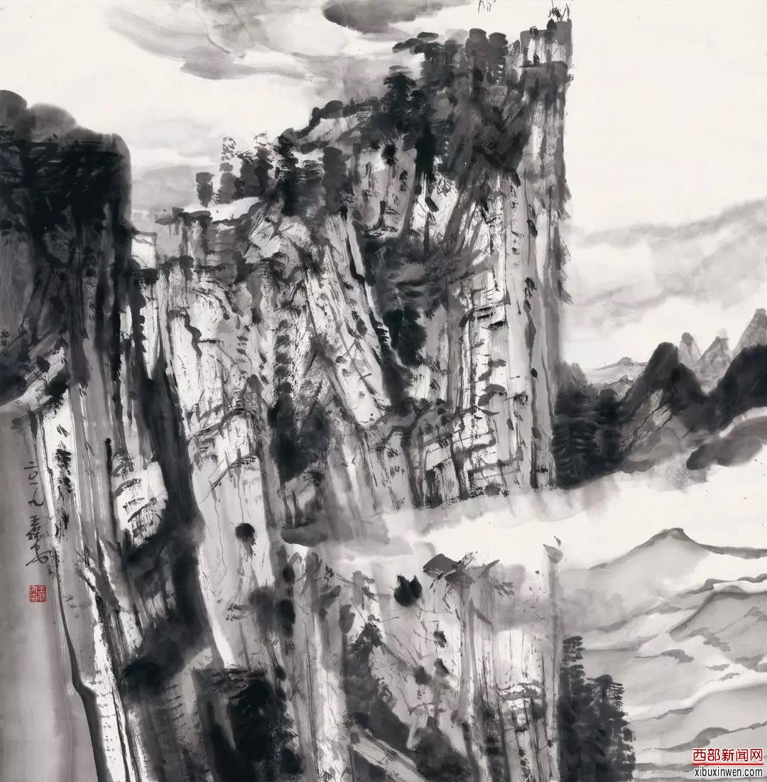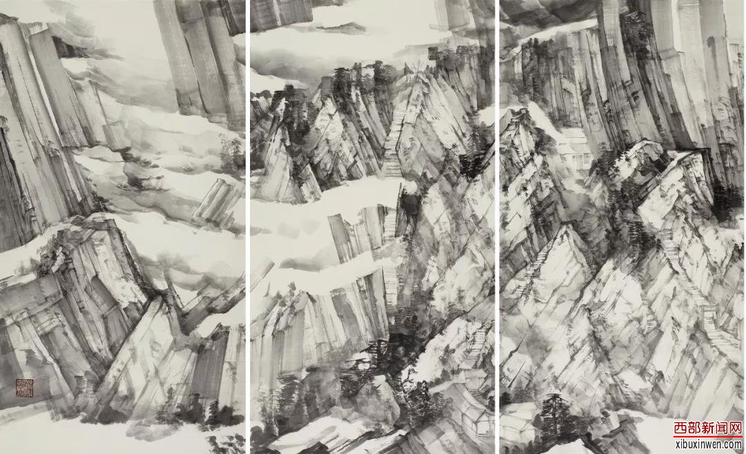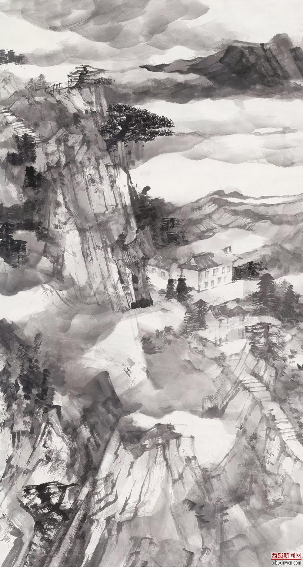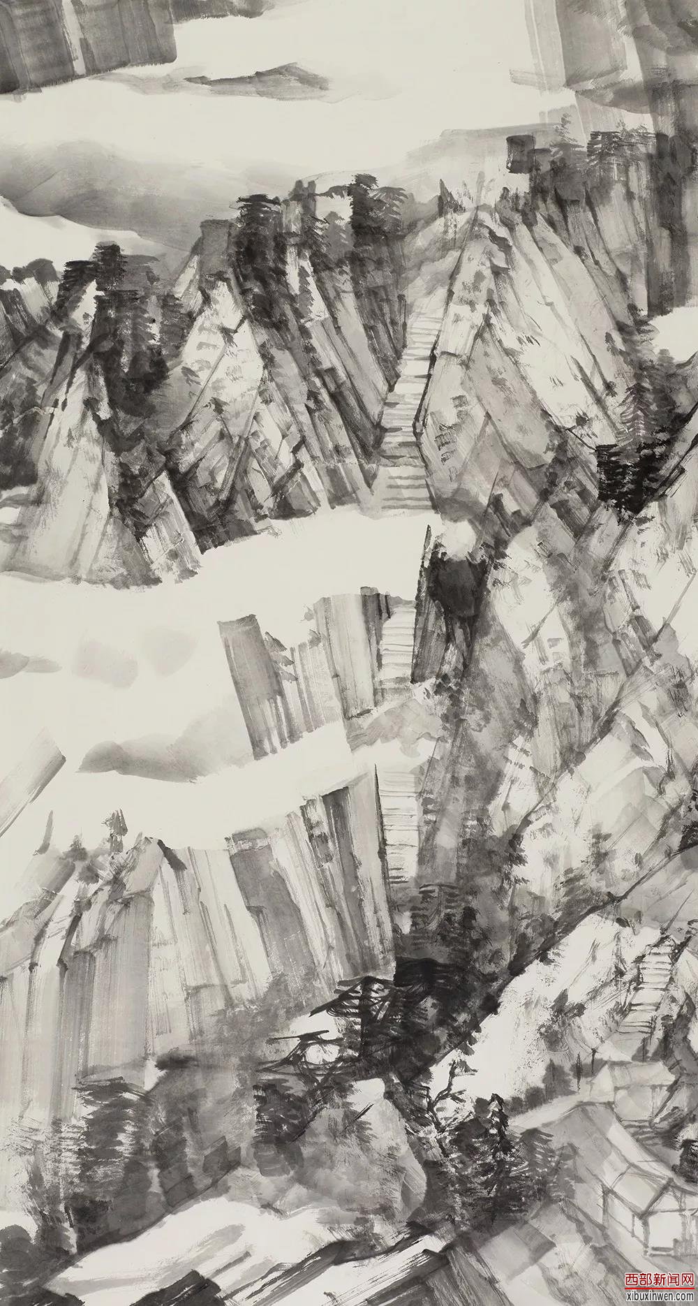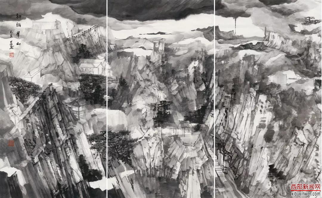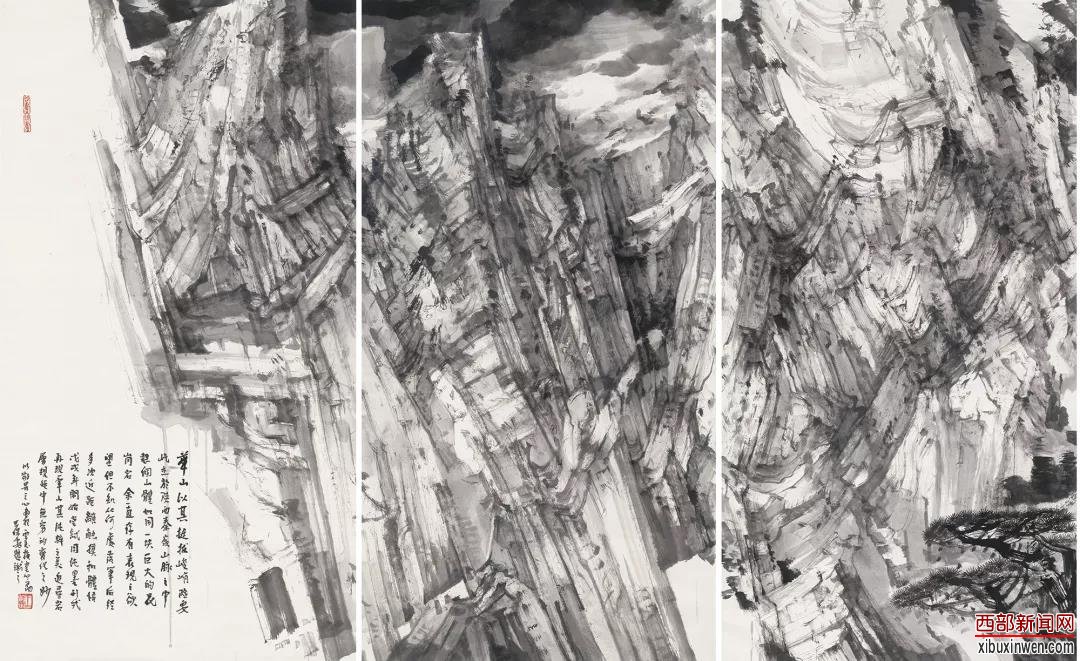 长久以来的写生积累让我又有了去创作与挑战的冲动,这座形式自由、性格坚毅、风雨不动、岿然独存的“神山”给予我精神上的启发。西岳华山无人不知,若想表达并非易事,对于这样一个不断重复却又难以驾驭的题材我也在不断思索。我始终坚信一幅作品即是一个人对外诉说的窗口,具有极强的主观意识。夏日的三伏更是为华山创作增添了不竭的热度,加之内心的狂热创作欲望更是空前。之前的多次徒步上山,路途之中鲜有同行,待到山顶却人头攒动,与之相比较,自己心中却多了几分满足。无数的画家崇尚表现华山西峰的陡峭和险峻,我也在揣摩西峰之上是否还有其他的留恋之处。随着时间的推移,经过多次与华山近距离接触,产生了去表现的冲动。创作时每每都会充斥着一种征服的欲望和表现的冲动,笔墨间狂热的躁动会留下坚实的笔痕,一幅《西岳雄魂》仍无法安抚自己的冲动,系列的想法便应运而生。以华山为主题的创作已经形成其特有的语言符号,所以在这些作品的创作思路上要避险就平、避重就轻,但外刚内柔的本体语言不能丢,在用笔上尽力找出北派山水特有的如花岗岩般坚硬的皴法。