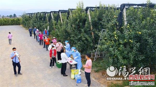 阳光讯(记者 张伟 通讯员 高原原)“请大家到核酸采样台排队,出示二维码进行核酸检测……”8月23日早上7点,宝鸡市千阳县南寨镇海升苹果园正在给前来进货的客商做核酸采集。
