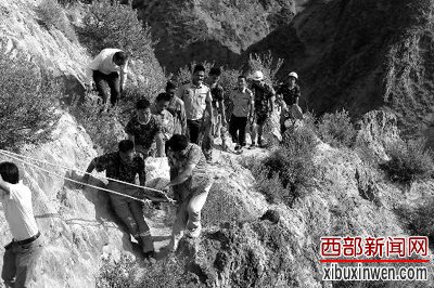 8月22日,靖边县公安消防中队用绳索将伤者成功救上山顶 通讯员杜靖摄
