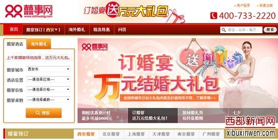 近日,国内领先的婚宴预订平台喜事网,全力进军西安婚宴预订市场,大力拓展西安地区的在线婚宴预订业务。据了解,自二季度进驻西安市场后,喜事网已迅速与当地各大酒店、餐饮企业建立了合作,获得了众多企业的认可和青睐。与此同时,连续几个月,在线预订婚宴用户数量成倍递增,越来越多的西安市民开始使用喜事网提供的在线预订婚宴服务。
