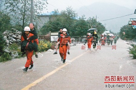 9月1日,太白县消防中队接到群众报警,在青峰峡景区救出因河水暴涨被困的69名游客。图为消防官兵背着行走不便的老年人脱险。
