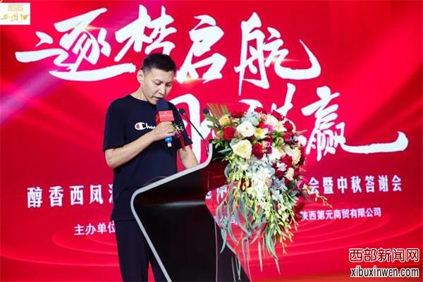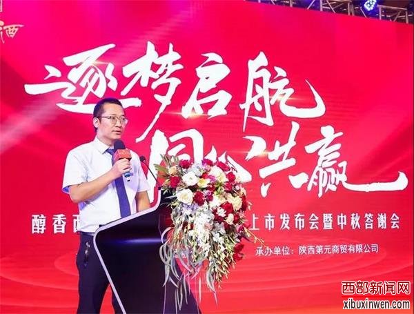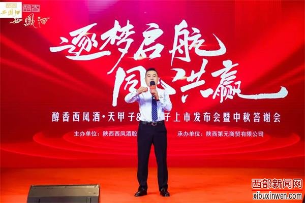 陕西第元商贸有限公司销售总监赵鹏辉在会上讲话,他首先对两款新品醇香西凤酒天甲子、地甲子为大家进行了详细的介绍。