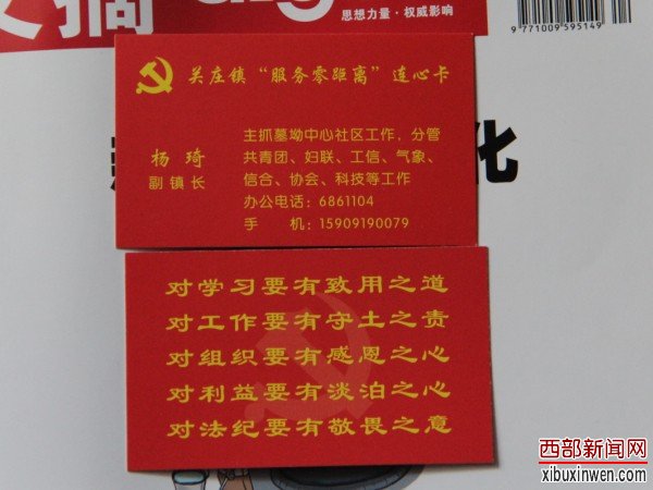 大红色的连心卡,正面左上角镶嵌着党徽,下面有姓名、职务、主管业务范围、办公电话、手机号码等信息。连心卡背面印着五句话:对学习要有致用之道;对工作要有守土之责;对组织要有感恩之心;对利益要有淡泊之心;对法纪要有敬畏之意。记者赞誉这些词语好,全面而务实。杨琦副镇长说:“这些词都是姚伟书记、闫军镇长和人大主席高锋等几位领导共同研究的。践行群众路线教育,就要这样润物细无声。这些词语让群众看到干部零距离服务的真诚,让群众有信心,有话能说,有事能讲,有困难能求助。”