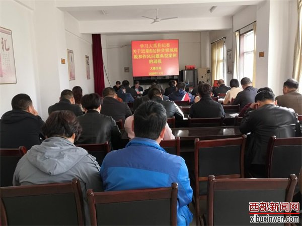 会上,监察室组织学习了《关于近期查处6起扶贫领域腐败和作风问题典型案例的通报》全文,通报了近期查处的冯村镇政府干部赵新民失职失责问题、朝邑镇官庄村原党支部书记赵三元失职失责问题、双泉镇北龙池村原支部书记兼村委会主任王信社违规挪用扶贫资金问题、韦林镇耿园村原党支部副书记周建设违规向贫困户收取费用问题、苏村镇堡子村原治保员刘刚向贫困户吃拿卡要问题、东城街道东关社区秦晓莉违规领取低保金问题6起典型案例。