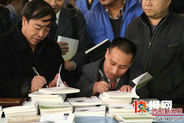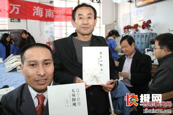 陕西省残疾人作家协会主席薛云平(左)和残疾人作家王庭德在签名赠书