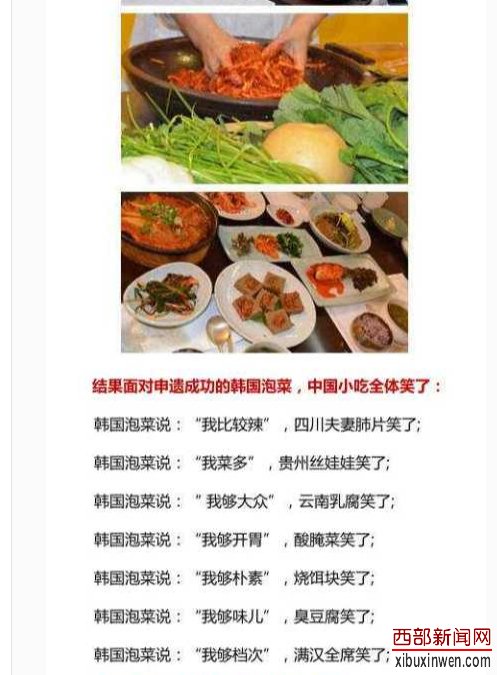 “韩国泡菜申遗成功,煎饼果子肉夹馍、海南鸡饭臭豆腐、重庆火锅热干面、发面馒头麻辣烫、生煎包子小馄饨……集体不服!”网友“作业本”的微博立即被上万网友转发,并自发进行了一场中国美食的接力赛。