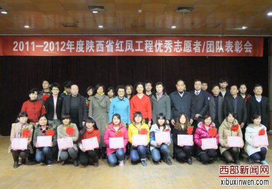 表彰会上,陕西省精神文明办周珑处长宣读了《关于表彰2011—2012年度红凤工程优秀志愿者、团队的决定》,西北政法大学红凤社、“红凤北京”联络小组、西安电子科技大学红凤工程志愿者协会、西安医学院红凤社、宝鸡文理学院手牵手红凤协会、陕西省师范大学志翔社、西安外国语大学红凤同心社、陕西巾帼“和谐家庭”志愿者服务队、莲湖区少年宫党支部志愿服务队、西安爱知中学初二22班红凤春笋服务队等20个社团荣获“陕西省红凤工程志愿者协会优秀志愿者团队”