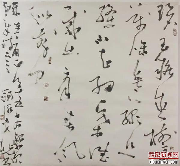 那时,我偶然在同事办公室的墙上,见到他的四尺横幅草书,眼球立刻就被紧紧地吸引住了,内容已记不得了,但对他的用笔印象极为深刻。枯笔横扫,轻重徐疾,笔势翻澜,飘然不羁,贼毫百出,颇为爽利,用同事的话说,每个字就像是一条条活着的龙蛇。