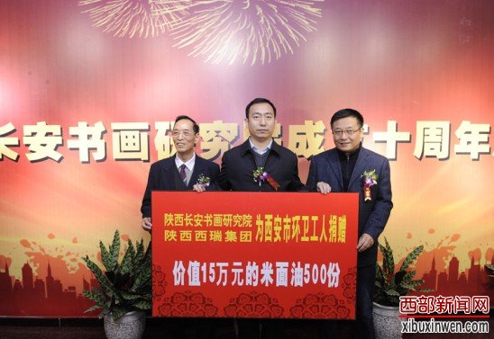 本次庆典仪式由执行院长兼秘书长潘炜主持,院长萧焕先生致欢迎辞,回顾了研究院走过的十年辉煌历程和在书画艺术上取得的卓越成就,感谢社会各界对研究院的关怀呵护,感谢众多企业界人士对研究院的发展给予的大力支持。陕西省决策咨询委员会主任、原省纪委书记李焕政同志在庆典仪式发言中也道出了研究院书画家对艺术的孜孜以求,对国家的拳拳之心,对困难群众的慈爱捐助,表现出了人民艺术家为人民的高尚品德。他对陕西荣民集团董事长史贵禄先生支持弘扬传统文化,投身社会主义文化建设大加赞赏。随后,韩国驻西安领事馆总领事全哉垣先生上台讲话,盛赞陕西长安书画研究院多年来三赴韩国举办艺术展览,三次邀请韩国艺术家来华访问,促进了中韩传统艺术的交流,加深了两国人民的感情。接下来,庆典仪式安排陕西长安书画研究院与陕西西瑞集团为环卫工人献爱心仪式,捐赠价值15万元的米面油。陕陕西长安书画研究院院长萧焕,陕西西瑞集团董事长刘志军上台共同捐赠,西安市市容园林局郝卫国处长代表西安环卫工作接受了捐赠。庆典仪式在欢快的音乐声中结束了,来宾们继续参观在展厅展出的九十余幅书画精品。