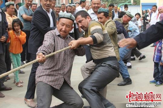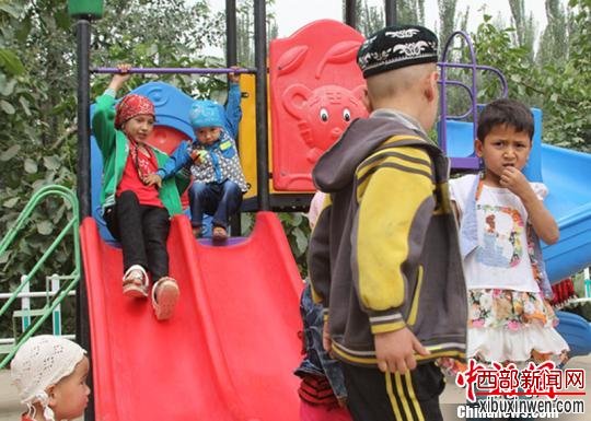 上午11时,记者走近策勒县达玛沟古勒铁日干村,村委会的院子聚集了男女老少,年轻的媳妇带着孩子在玩游乐设备,一些老人在凉棚下聊天,篮球、台球、兵乓球场地到处围满了年轻人。